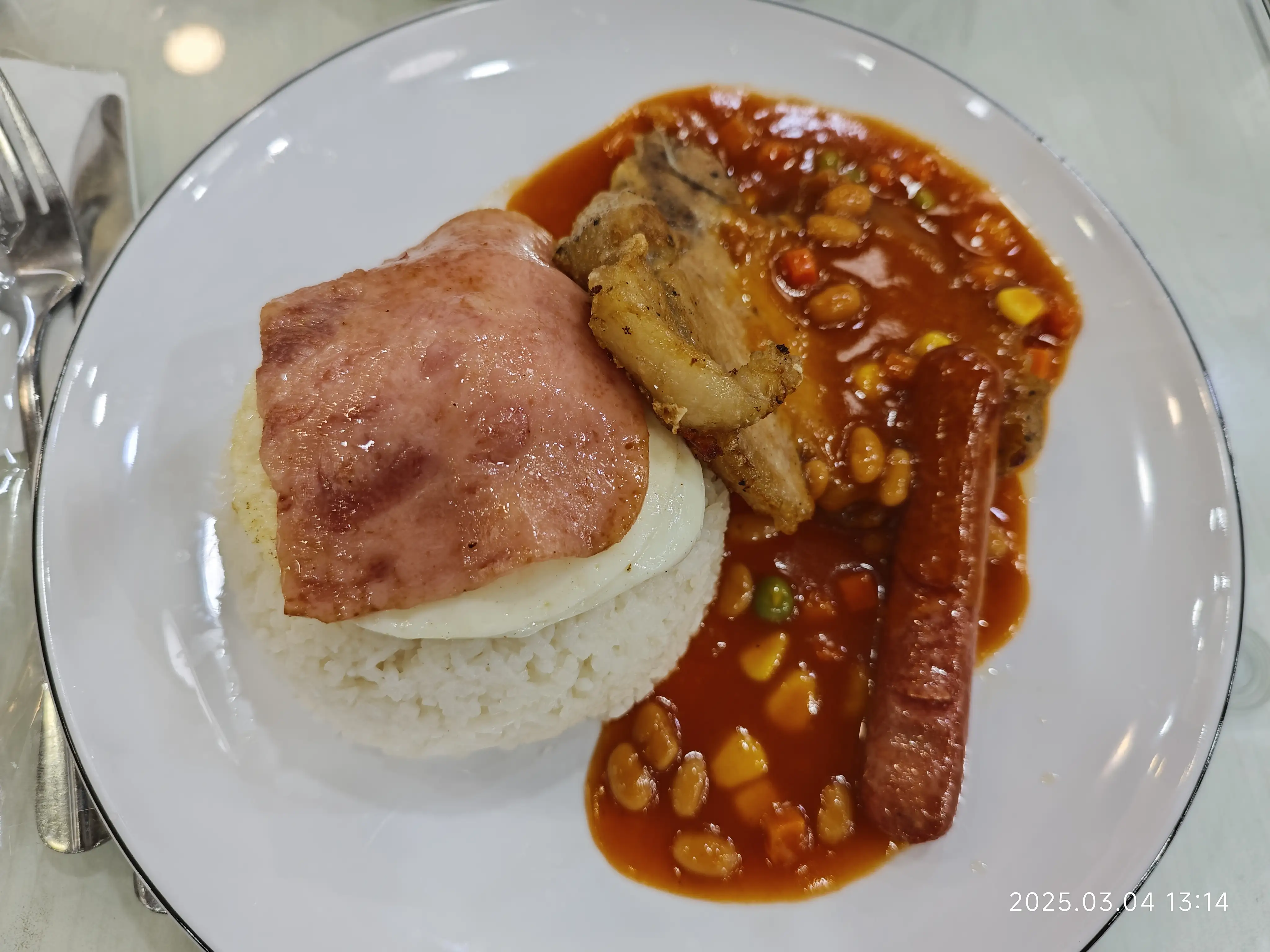 在茶餐厅吃的沙丹豬排飯。有猪排、烤肠、培根、鸡蛋。